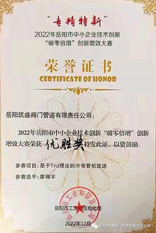 岳筑宣2022年12月6日訊:2022年12月5日我公司委派技術(shù)部廖翔宇工程師參加了2022年岳陽市“專精特新”中小企業(yè)技術(shù)創(chuàng)新“破零倍增”創(chuàng)新增效大賽基于Triz理論的冷彎管機(jī)改進(jìn)項(xiàng)目中榮獲優(yōu)勝獎(jiǎng)!